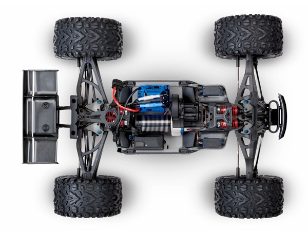 Modell 86086-4: E-Revo, Maßstab 1:10, 4WD, wasserdicht, komplett montiert, Ready-to-Race®, mit TQi™ 2,4GHz Fernsteuerung, mit Traxxas Stability Management® - TSM, VXL-6s Fahrtenregler, Velineon 2200kV Brushless Motor, Self-Righting-System und ProGraphix® Clipless Karosserie. Ohne Ladegerät und Akkus.